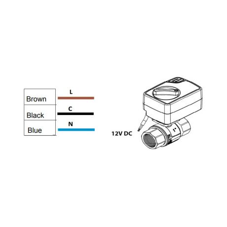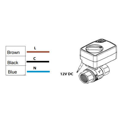 Принцип действия крана с электроприводом на 12В (цвет электропривода синий с черным) следующий. На коричневый провод постоянно подается «фаза» питающего напряжения 12В, на голубой провод постоянно подается «ноль». При подаче через подходящее устройство на черный провод «фазы» питающего напряжения 12В кран переводится в положение «закрыто», при отсутствии на черном проводе «фазы» питающего напряжения 12В, кран переводится в положение «открыто».