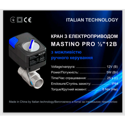 Кран с электроприводом Mastino 12В - состоит из крана латунь CW617N и электропривода 12В постоянного тока. В электроприводе находится кнопка ручного открытия/закрытия крана. Управление работой электропривода производится с использованием трех проводов: коричневый, черный и голубой. Ручной переключатель использовать только при обесточенном электроприводе. В противном случае вы можете повредить механизм электропривода.