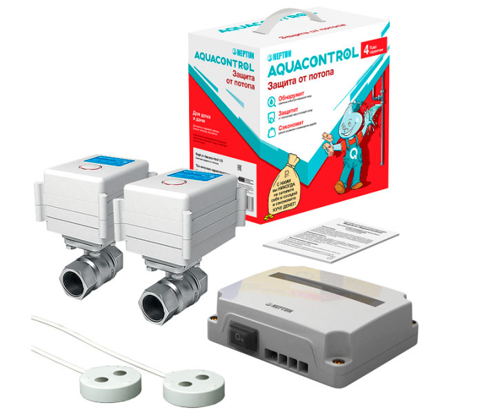 Система от протечки воды в квартире Neptun Aquacontrol это бюджетное решения чтобы устранить прорыв, утечку воды в вашей квартире или частном доме, особенностью модели являются два крана с электроприводом и два датчика протечки. В случаи аварийной протечки система моментально закрывает краны и блокирует подачу воды, подает сигнал (звуковой), сразу после попадания воды на датчик затопления. Может предотвратить существенный ущерб Вам и вашим соседям. Устанавливайте систему Нептун (антипотоп) и живите спокойно. А также Вы можете ознакомиться и приобрести систему Neptun Bugatti Base уже в которой в комплекте идут краны Вugatti (Италия).