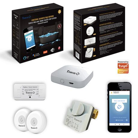 Система защиты от потопа для умного дома Tervix ZigBee Water Stop на 1 трубу 1/2" с 2-х ходовым шаровым клапаном и беспроводными датчиками – это современная система для удаленного обнаружения и предотвращения потопа. Система работает по энергоэффективному протоколу передачи данных ZigBee – датчики могут работать на одной батарейке больше 2 лет.