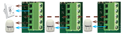 - Если используется количество приводов больше, чем количество клемм, то на одну клемму можно подключить несколько термоприводов.