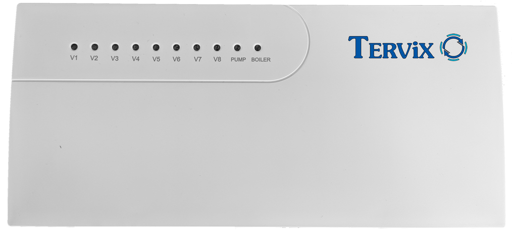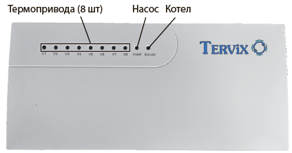 Принцип работы: Tervix Pro Line С8 разработан для автоматизированного управления 8 контурами/каналами комнатный термостат - термопривод, циркуляционным насосом и котлом.