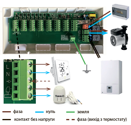 Включение любого термостата на нагрев вызывает запуск насоса и котла (реле (котел) переходит в положение COM-NO). Происходит включение соответствующего термопривода и сигнального светодиода.