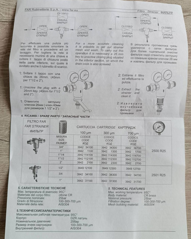 Корпус устройства изготовлен из латуни марки CB770S и покрыт сверху хромом, что обеспечивает ему высокую защищенность от коррозии и большой срок службы. Сетка (картридж) фильтра с ячейками в 100 мкм изготовлена из стали нержавеющей марки AISI 304.