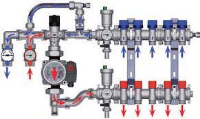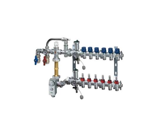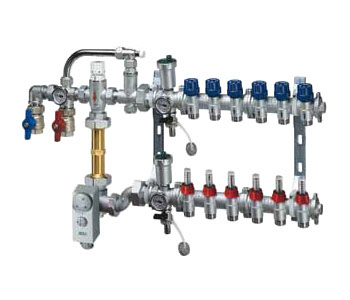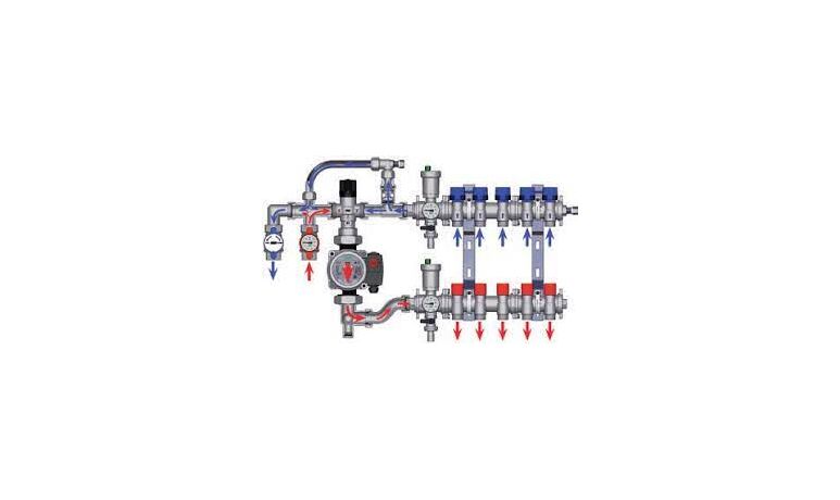 FAR-FK358413402 Коллектор для теплого пола с насосной группой – это готовый комплект, позволяющий регулировать температуру теплоносителя для систем отопления полов. В системах отопления с использованием высокотемпературного котла или при комбинации радиаторного отопления и теплого пола необходимо снизить температуру теплоносителя, поступающую во вторичный контур теплого пола. Коллекторная группа ФАР укомплектована термостатическим смесительным клапаном, позволяющим снизить температуру до требуемого значения.