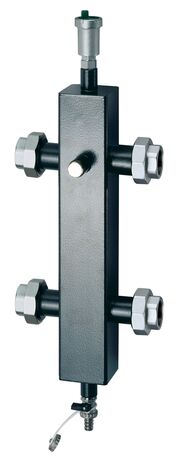 Гидрострелка (гидравлический разделитель) FAR FA 2161, укомплектована автоматическим воздухоотводчиком с обратным клапаном и сливным краном. На фронтальной стороне заглушенное отверстие 1/2" ВР для подключения манометра или термометра.