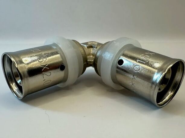 K-FP-017 Rsk. Угольник под опрессовку равносторонний 16 х 16 предназначен для создания неразъемных соединений трубопроводов из металлополимерных труб (PEX-AL, PE-AL, PERT-AL). Изготовлен из высококачественной латуни CW617N. Готовая продукция имеет никелированное покрытие.