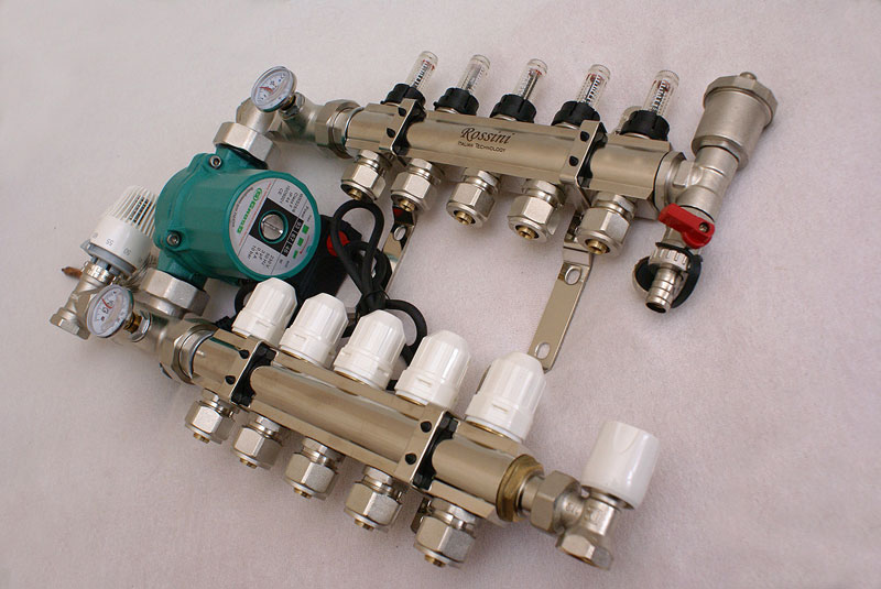 Недорогая гребенка (коллектор) для теплого пола в сборе ROSSINI от 2 до 12 выходов. Гарантия -1 год. Лучшее соотношение цена-качество. Коллектор собран в Украине полностью из комплектующих европейских производителей (Италия, Польша). В комлектацию входит: 2 никелированных латунных коллектора 1" с адаптерами для труб 16х2 (при необходимости возможна установка 17-х, 20-х евроконусов).