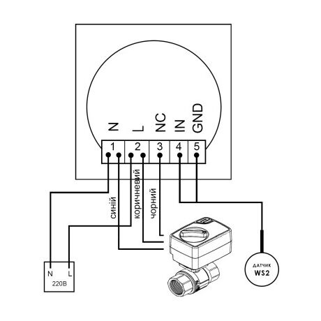 Рабочий режим. При подключении устройства к сети 220В по схеме происходит его включение и переход в рабочий режим, питание на клемме номер 1 включается на постоянной основе без лимита времени. Мигание зеленого светодиода. Краны открываются.