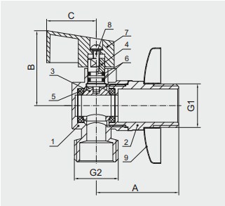1 – корпус; 2 – футорка; 3 – шар; 4 – шток; 5 – седельные кольца шара; 6 – уплотнительные кольца штока