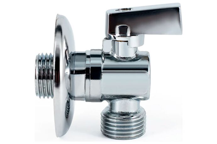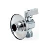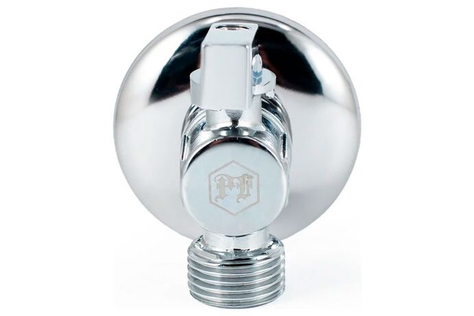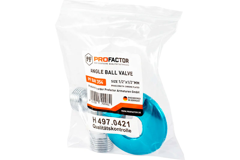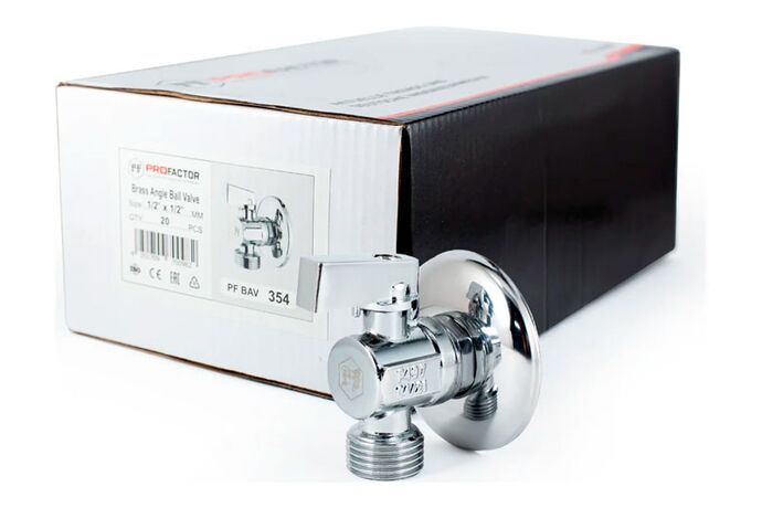 PF BAV 354. Profactor Кран шаровой угловой латунный хромированный с металлической ручкой полупроходной используется для подключения бытовой техники(стиральных и посудомоечных машин, водонагревателей, смесителей, сливных бачков и т.д.) к трубопроводу холодного и горячего водоснабжения, а также на любых других трубопроводах,транспортирующих среды, неагрессивные к материалам изделия: вода, растворы на основе гликоля. Максимальное содержание гликоля до 50%