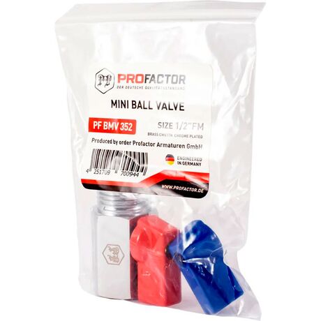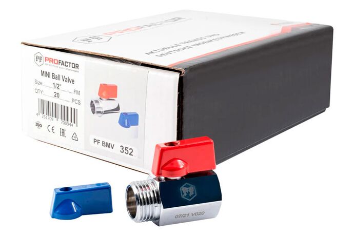 PF BMV 352. Profactor Кран шаровой Мини латунный хромированный застосовується як запірна арматура на трубопроводах систем питного, господарсько-побутового та промислового призначення, гарячого водопостачання, опалення, стисненого повітря, рідких вуглеводнів, а також на технологічних трубопроводах, що транспортують рідкі середовища неагресивні до матеріалів виробу: вода, розчини на основі гліколю (макс. До 50%). Кран «MINI» завдяки своїм компактним розмірам може встановлюватися в місцях, де неможливо встановити стандартний кульовий кран (при підключенні побутової техніки, на колекторних системах в колекторних шафах).