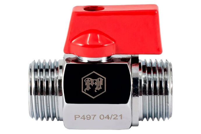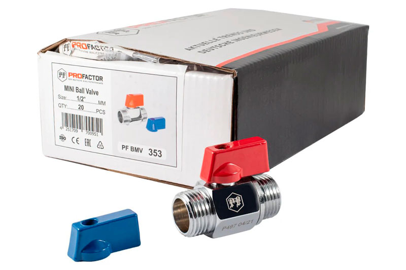 PF BMV 353. Profactor Кран шаровой Мини латунный хромированный застосовується як запірна арматура на трубопроводах систем питного, господарсько-побутового та промислового призначення, гарячого водопостачання, опалення, стисненого повітря, рідких вуглеводнів, а також на технологічних трубопроводах, що транспортують рідкі середовища неагресивні до матеріалів виробу: вода, розчини на основі гліколю (макс. До 50%). Кран «MINI» завдяки своїм компактним розмірам може встановлюватися в місцях, де неможливо встановити стандартний кульовий кран (при підключенні побутової техніки, на колекторних системах в колекторних шафах).