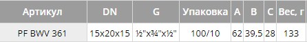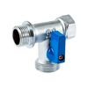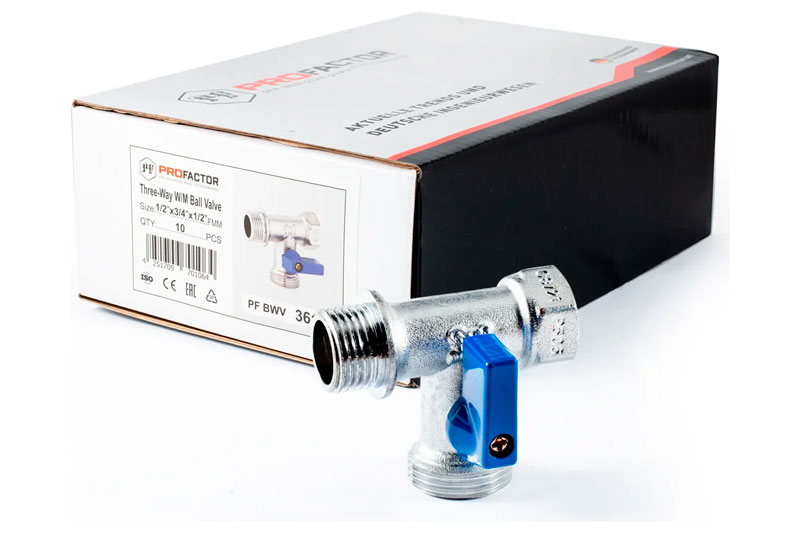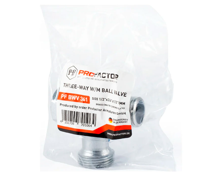PF BWV 361. Profactor Кран шаровой трёхходовой для бытовой техники хромированный с алюминиевой ручкой используется для подключения бытовой техники (стиральных и посудомоечных машин) к трубопроводу холодного и горячего водоснабжения, а также на любых других трубопроводах, транспортирующих среды неагрессивные к материалам изделия: вода, растворы на основе гликоля. Максимальное содержание гликоля до 50%.