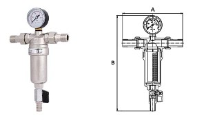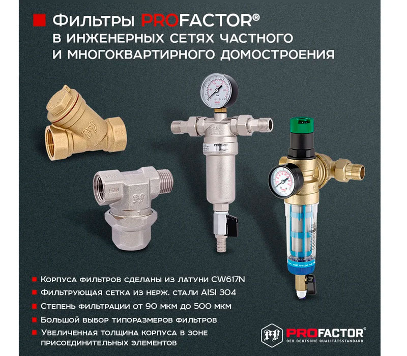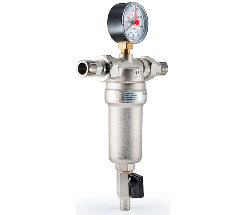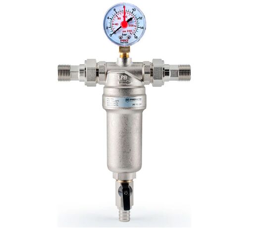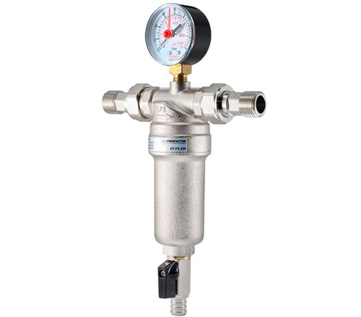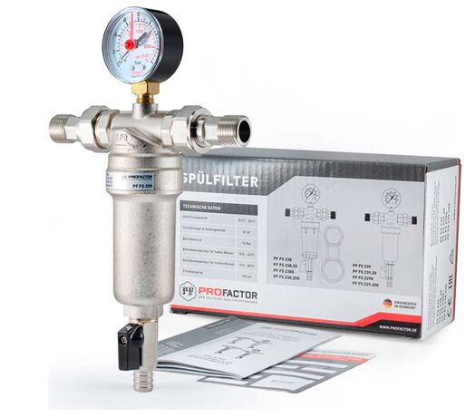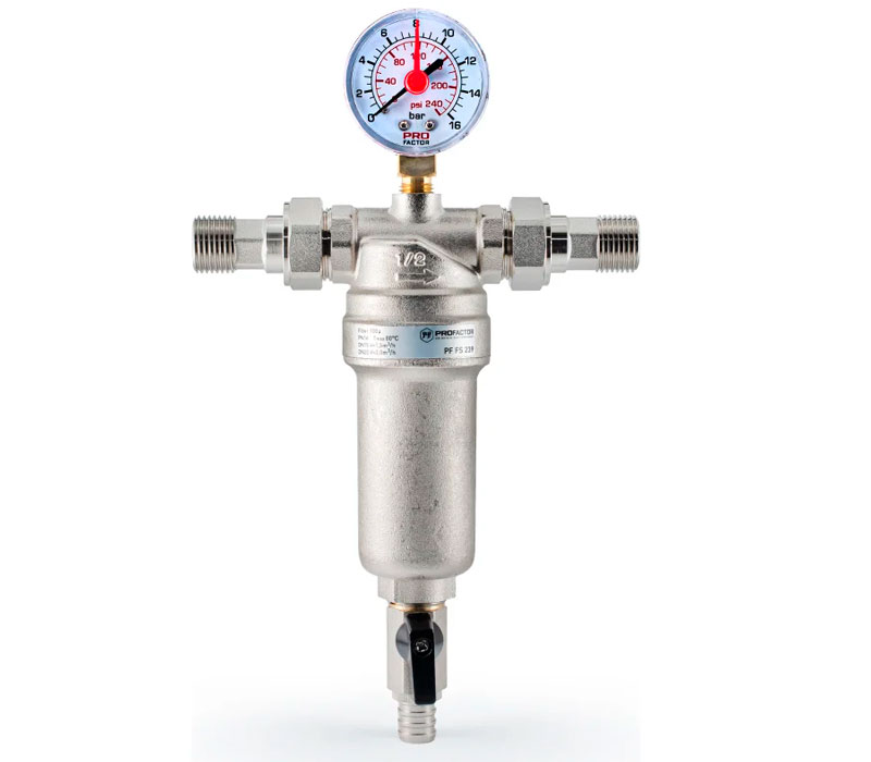 PF FS 239G. Profactor Фильтр промывной с манометром и латунной колбой для горячей воды предназначен для очистки воды от механических загрязнений. Защищает трубопровод и установленную на нем арматуру и оборудование от попадания в воду нерастворимых примесей: песка, стружки, пакли, ржавчины и т.п. Фильтр устанавливается перед водосчетчиками, регулирующими клапанами, расходомерами, насосами с мокрым ротором электропривода и другими устройствами с повышенными требованиями к чистоте воды. Фильтр не предназначен для защиты от водорастворимых веществ, растворителей, смазок, масел и других смазочных материалов.
