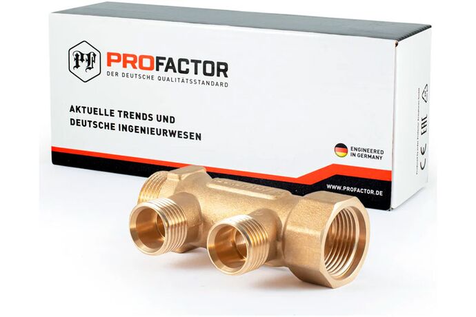 PF MF 263. Profactor Коллектор латунный в/н с наружной резьбой используется в системах водоснабжения, водяного радиаторного или напольного отопления для распределения и регулирования рабочей среды в системе. Каждая труба системы водоснабжения, отопительной системы водяного отопления или теплого водяного пола подключается к коллектору, что позволяет осуществлять регулировку и контроль потока жидкости индивидуально в каждой линии. Коллекторы могут использоваться на трубопроводах, транспортирующих жидкие среды, неагрессивные к материалам изделия (вода, антифриз на основе этиленгликоля.