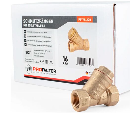 Фильтр грубой очистки PF YS 220. Profactor Фильтр косой латунный с ушком для пломбы применяется для очистки потока фильтруемой среды от механических примесей в системах трубопроводов холодной и горячей воды, газов, жидких углеводородов в пределах допустимых значений по температуре и давлению, указанных в таблице технических характеристик.