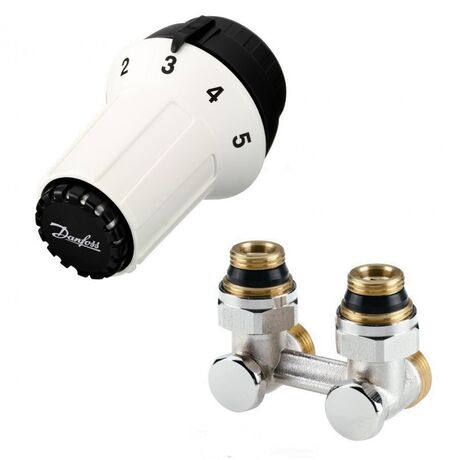Комплект для нижнього підключення: "Н"-подібний запірний клапан RLV-KS + термостатичний елемент RAS-CK (для радіаторів із вбудованими вентильними вставками M30 x 1,5), підключення до системи G3/4" підключення до радіатора G1/2". Діапазон регулювання: 8-28 °С.
