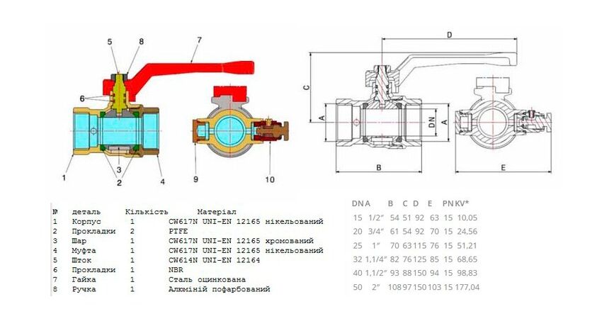 Кран керується зручною ручкою типу «метелик» і має внутрішню різьбу, що спрощує монтаж у системах водопостачання та опалення.