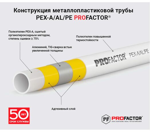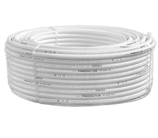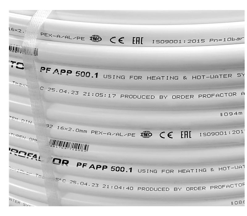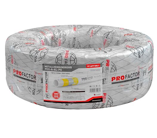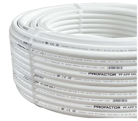 PF APP 500. Profactor Труба металопластикова зшитий поліетилен PE/AL/PEX-a складається з двох шарів високомолекулярного зшитого поліетилену і несучої алюмінієвої оболонки, пов'язаних між собою. Завдяки такій структурі труба поєднує в собі переваги металу та пластику, володіючи гарною гнучкістю та високою міцністю. Абсолютна непроникність цих труб для кисню надійно захищає металеві елементи системи від можливої корозії.