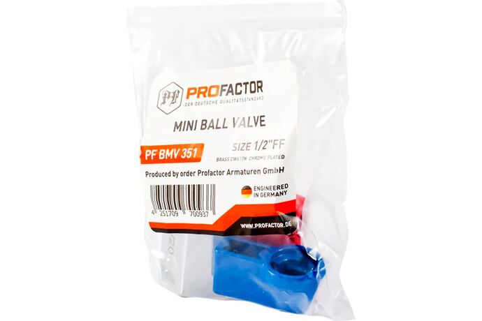 PF BMV 351. Profactor Кран кульовий Міні латунний хромований застосовується як запірна арматура на трубопроводах систем питного, господарсько-побутового та промислового призначення, гарячого водопостачання, опалення, стисненого повітря, рідких вуглеводнів, а також на технологічних трубопроводах, транспортуючих основі гліколю. Максимальний вміст гліколю до 50%.Кран напівпрохідної кульової «MINI» завдяки своїм компактним розмірам може встановлюватися в місцях, де неможливо встановити стандартний кульовий кран (при підключенні побутової техніки, на колекторних системах в колекторних шафах).