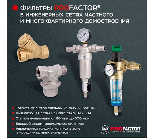 PF FS 239G. Profactor Фільтр промивний з манометром та латунною колбою для гарячої води призначений для очищення води від механічних забруднень. Захищає трубопровід та встановлену на ньому арматуру та обладнання від попадання у воду нерозчинних домішок: піску, стружки, клоччя, іржі тощо. Фільтр встановлюється перед водолічильниками, регулюючими клапанами, витратомірами, насосами з мокрим ротором електроприводу та іншими пристроями з підвищеними вимогами до чистоти води. Фільтр не призначений для захисту від водорозчинних речовин, розчинників, мастил, масел та інших мастильних матеріалів.