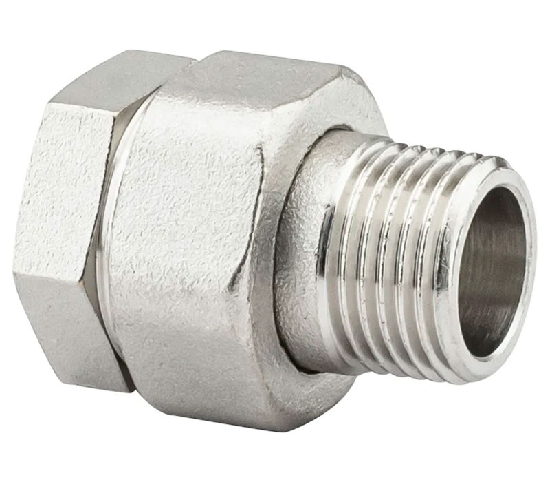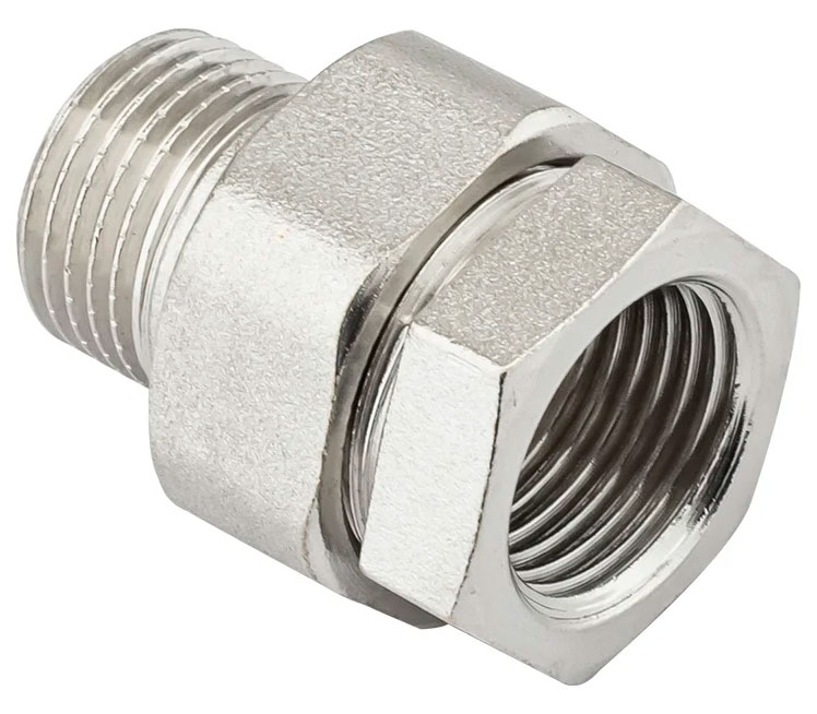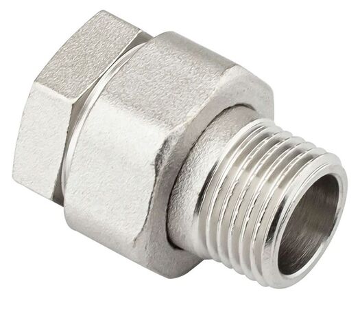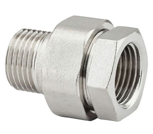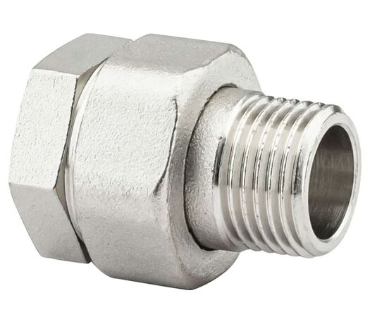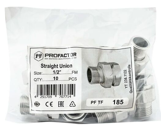 PF TF 185. Profactor З'єднання з напівзгоном пряме в/з латунне нікельоване призначено для створення з'єднань (у тому числі роз'ємного типу) при монтажі різних трубопровідних систем водопостачання, опалення, стисненого повітря та інших, фітингів.