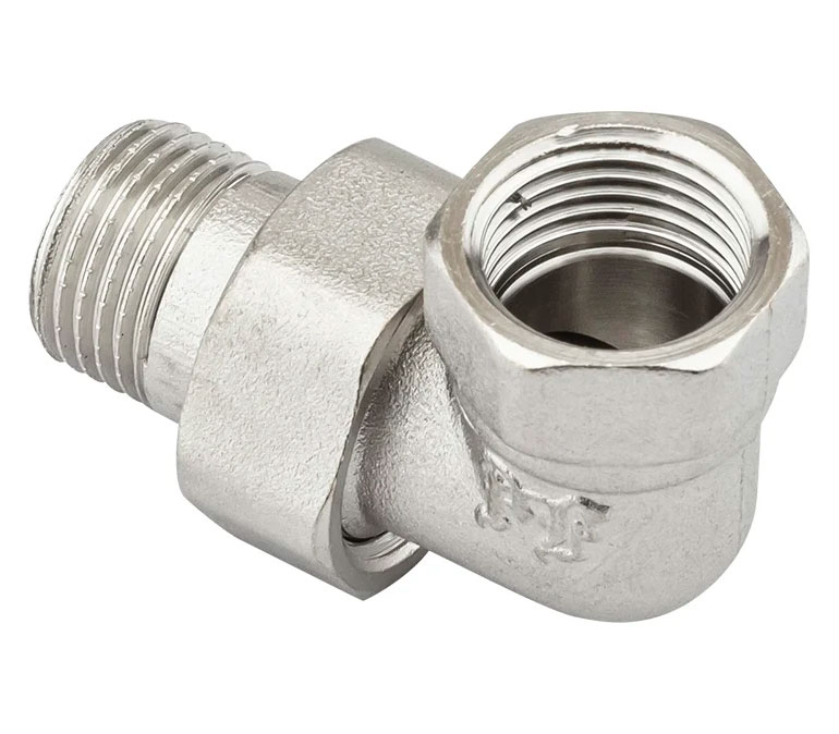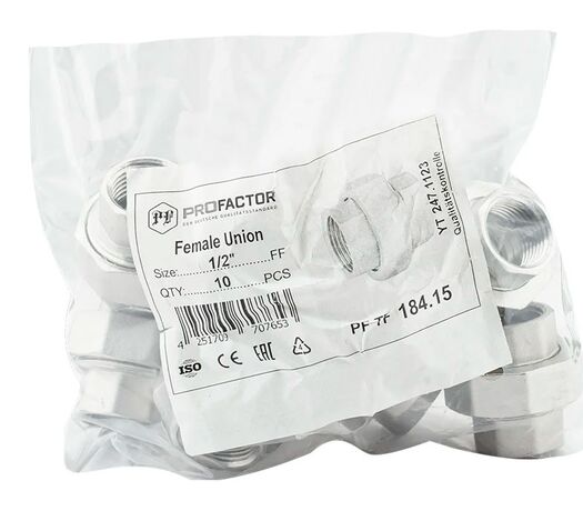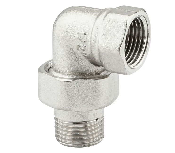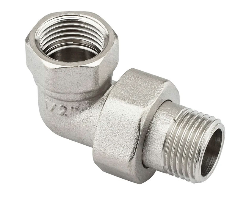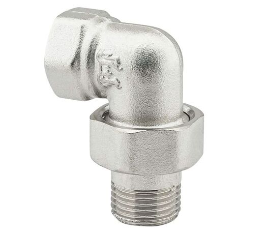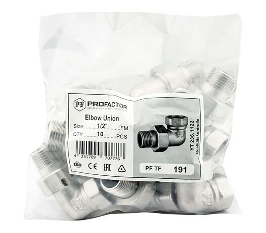 PF TF 191. Profactor З'єднання з напівзгоном "американка" кутове в/з латунне нікельоване призначено для створення з'єднань (у тому числі роз'ємного типу) при монтажі різних трубопровідних систем водопостачання, опалення, стисненого повітря та інших, фітингів.