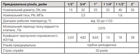 - робочий тиск 2,5 МПа (25 бар) (для розмірів 1/2", 3/4", 1"); 1,6 МПа (16 бар) (для розмірів 1 1/4", 1 1/2”, 2")