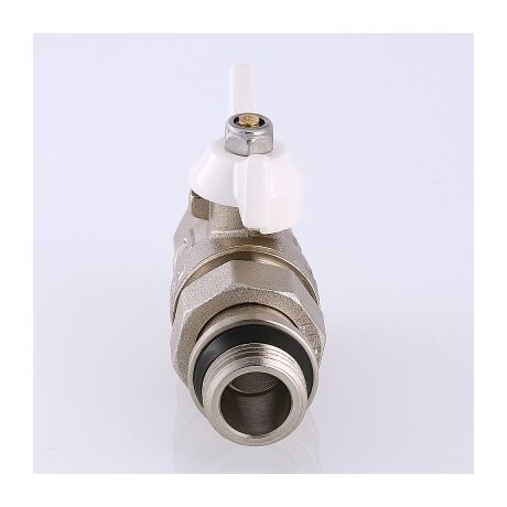 (VT.227.NRW) Прямий повнопрохідний ремонтопридатний кульовий кран зі збільшеним ресурсом. З'єднаний накидною гайкою з різьбовим напівзгоном. Корпуси деталей – латунні, нікельовані. Кран оснащений ручкою типу «метелик» із потовщеною стінкою з алюмінієвого сплаву та епоксидним фарбуванням білого кольору. Напівгон укомплектований кільцем ущільнювача з еластомеру EPDM. Різьблення приєднань – внутрішнє/зовнішнє.