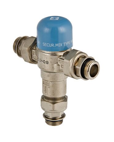 (VT.MT10NR) Триходовий термостатичний змішувальний клапан VALTEC THERMOMIX призначений для автоматичної підтримки заданої температури в системі гарячого водопостачання. Її перевищення виключається навіть за повного відключення холодної води, що дозволяє використовувати змішувач у школах, дитячих садках, інших громадських будівлях. Клапан оперативно реагує на зміну температури та тиску вхідних потоків. Модель NR – нерегульована, з фіксованим заводським налаштуванням (47 °C). Змішувальний клапан виконаний із якісної латуні, нікельований. Вбудований термочутливий елемент – рідинного типу (наповнений толуолом). Патрубки клапана з'єднані гайками з напівзгонами. Різьблення приєднань – зовнішня. Входи змішувача оснащені зворотними клапанами із нейлону. Максимальна температура на вході гарячої води – 90 °C, допустимий робочий тиск вхідних потоків – до 10 бар.