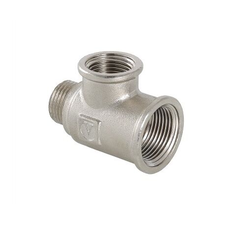 VTr.134. Різьбовий фітинг - трійник з переходом на зовнішнє різьблення виготовлений з латуні марки CW617N методом гарячого штампування з наступним нанесенням гальванопокриття нікелю. Застосовується для створення роз'ємних різьбових з'єднань на трубопроводах із сталевих, мідних, латунних, пластикових та металопластикових труб.