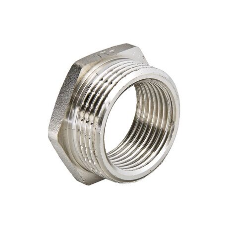 (VTr.581.N) Футорка – фітинг, що забезпечує з'єднання труб різного типорозміру, підключення трубопроводу до елемента системи з великим діаметром патрубка, ремонт (заміну) пошкодженого різьблення. Виріб виконаний з латуні марки CW617N, нікельований. Різьблення – зовнішнє/внутрішнє, за типом – трубне циліндрове, сумісне із зовнішньою конічною. Шестигранна головка футорки служить її вкручуванням гайковим ключем. Максимальний робочий тиск використання з'єднувача залежить від температури середовища: 250 ° С – 2,7/1,7 бар, 200 – 3,0/2,7, 120 – 40/25 (до/більше 1").