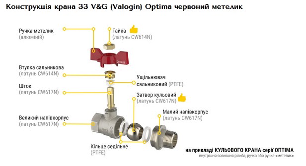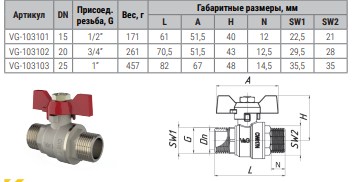 VG-1031. V&G Valogin Кран шаровый Optima красная бабочка используется для перекрытия потока рабочей среды на трубопроводах, оборудовании и емкостях систем: питьевого и хозяйственного питьевого назначения; горячего водоснабжения; отопление; сжатого воздуха; технологических трубопроводов, оборудования и емкостях, предназначенных для веществ, не агрессивных к материалам крана.