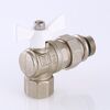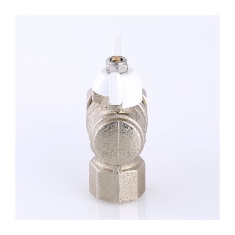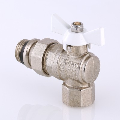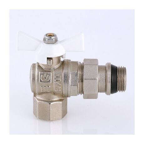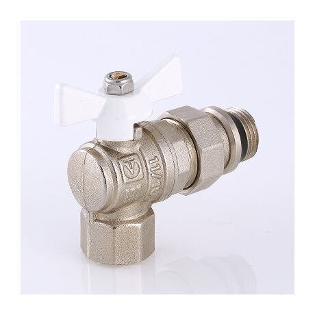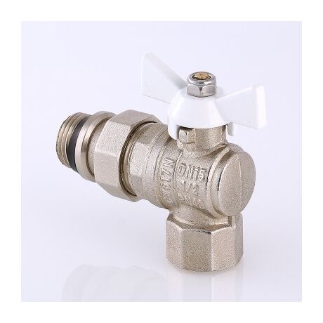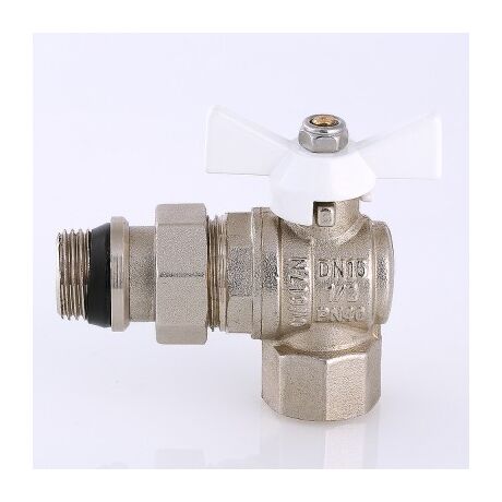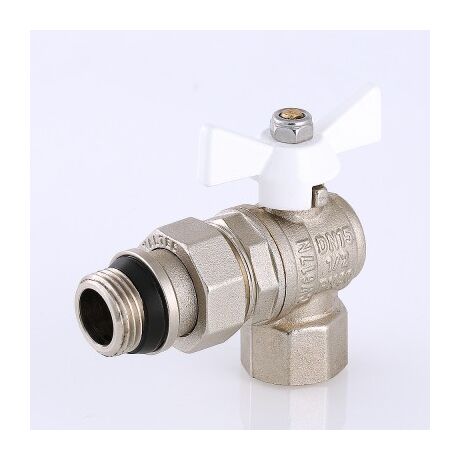 (VT.228.NRW) Угловой полнопроходной ремонтопригодный шаровой кран с увеличенным ресурсом. Соединен накидной гайкой с резьбовым полусгоном. Корпуса деталей – латунные, никелированные. Кран оснащен ручкой типа «бабочка» с утолщенной стенкой из алюминиевого сплава и эпоксидным покрытием белого цвета. Полусгон укомплектован уплотнительным кольцом из эластомера EPDM. Резьба присоединений – внутренняя/наружная.