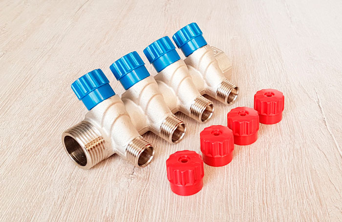 (VTc.560.N) Латунный никелированный коллектор на 2, 3 и 4 выхода диаметром 1/2" с наружной резьбой. На каждом выходе предусмотрен вентиль для регулирования расхода рабочей среды со средним полным ресурсом 8 тыс. циклов. Диаметр коллектора – 3/4 или 1", резьба – внутренняя/наружная. Ремонтопригодный. Рабочая температура теплоносителя – до 110 °С, давление – до 10 бар. Применяется для распределения потоков жидкостей в контурах теплого пола, радиаторного отопления, холодного и горячего водоснабжения.