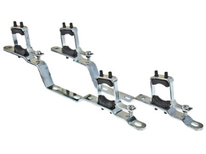 (VTc.IV130.N) Кронштейны для крепления пары (подающий и обратный) стандартных коллекторов условным диаметром 1" к несущей конструкции (стене или коллекторному шкафу). Состоят из крепежной планки, выполненной из стальной анодированной полосы толщиной 3 мм, к которой винтами крепится пара стальных никелированных хомутов толщиной 1 мм. В хомуты вставлены пластиковые прокладки, служащие тепло- и виброзащитой и предохраняющие коллекторы от механических повреждений. Кронштейны обеспечивают разнос коллекторов по высоте на 200 мм (между осями) и на 32 мм по глубине.