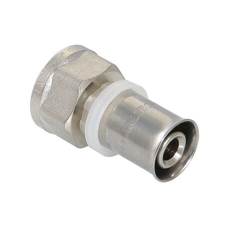 (VTm.202.N) Пресс-фитинг с переходом на внутреннюю резьбу применяется в качестве соединителя металлопластиковой (металлополимерной) либо PEX-трубы и элемента системы с резьбовым патрубком – крана, клапана и т.д. Областью применения фитинга являются системы водоснабжения, отопления, трубопроводы технологического назначения, транспортирующие среды, которые неагрессивны к латуни, материалу уплотнений (EPDM), используемой трубы. Корпус изделия никелирован. Пресс-гильза изготовлена из нержавеющей стали AISI 304, фиксатор – из нейлона. Резьба – внутренняя, соответствует ГОСТу 6357. Опрессовка гильзы фитинга производится пресс-инструментом с насадками «ТН».