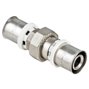 (VTm.263.N) Прямой равнопроходной пресс-фитинг для создания разъемного соединения на трубопроводе из металлополимерных труб (металлопластиковых труб) или труб из сшитого полиэтилена. Состоит из двух пресс-деталей: с переходом на наружную резьбу и с накидной гайкой.