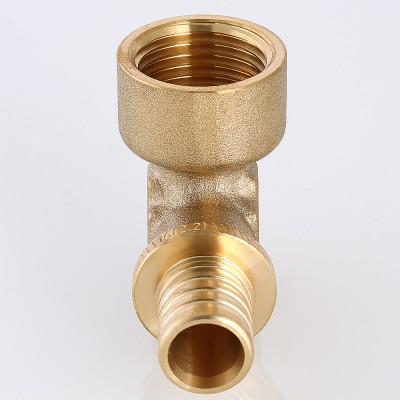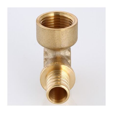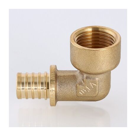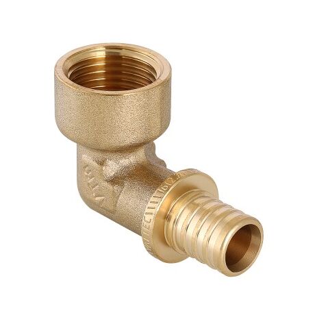 Угольник надвижной VTm.452.G – латунный аксиальный фитинг для соединения под углом 90° трубы из PEX или PE-RT с резьбовым элементом трубопровода (резьба фитинга – внутренняя).
