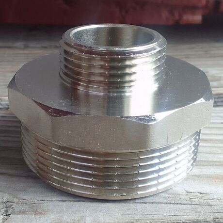 (VTr.580.N) Резьбовой фитинг – ниппель переходной. Обеспечивает соединение элементов трубопровода разного диаметра. Выполнен из латуни CW617N (евростандарт EN12165) горячим штампованием с последующим никелированием. Резьба обоих патрубков – наружная (тип – цилиндрическая трубная). Насечки на резьбе способствуют удержанию герметизирующего материала (например, сантехнического льна). Наличие шестигранного (под гаечный ключ) участка корпуса облегчает монтаж соединения. Максимальная температура использования ниппеля составляет 250 °С (при максимальном рабочем давлении 2,7/1,7 бар – для моделей условным диаметром до/более 1").